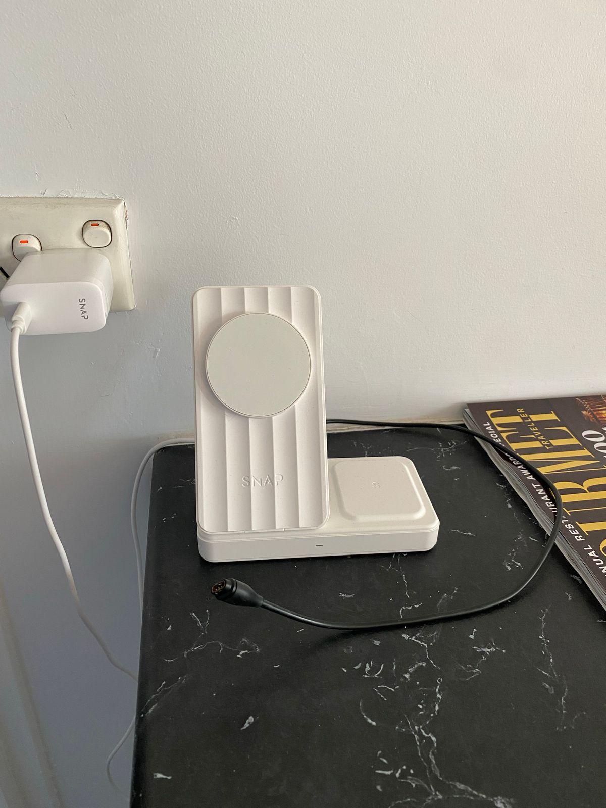 How many devices can I charge at the same time?The PowerBase 4 can charge up to 4 devices simultaneously. You can charge a mobile device on the MagSafe-compatible front, wireless earbuds on the top surface, another device using the retractable USB-C cable, and a fourth device via the rear USB port — where the watch adapter can also be connected.