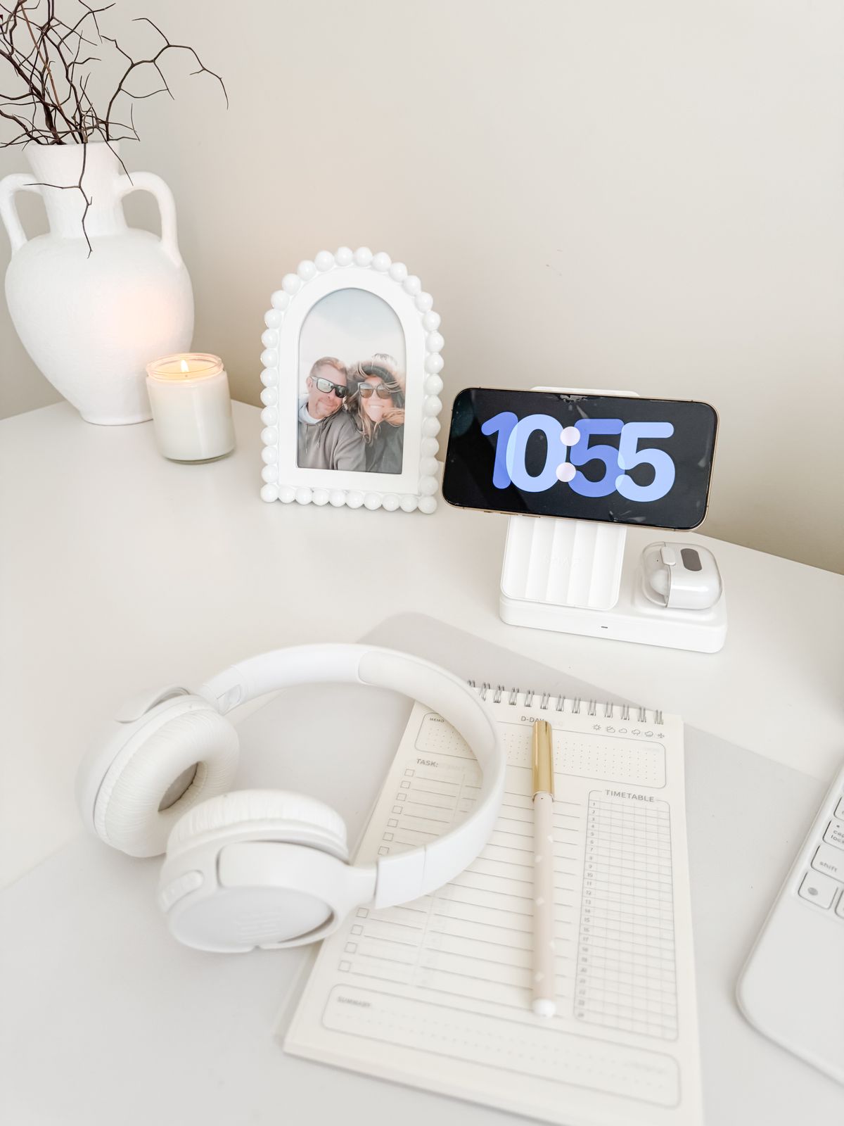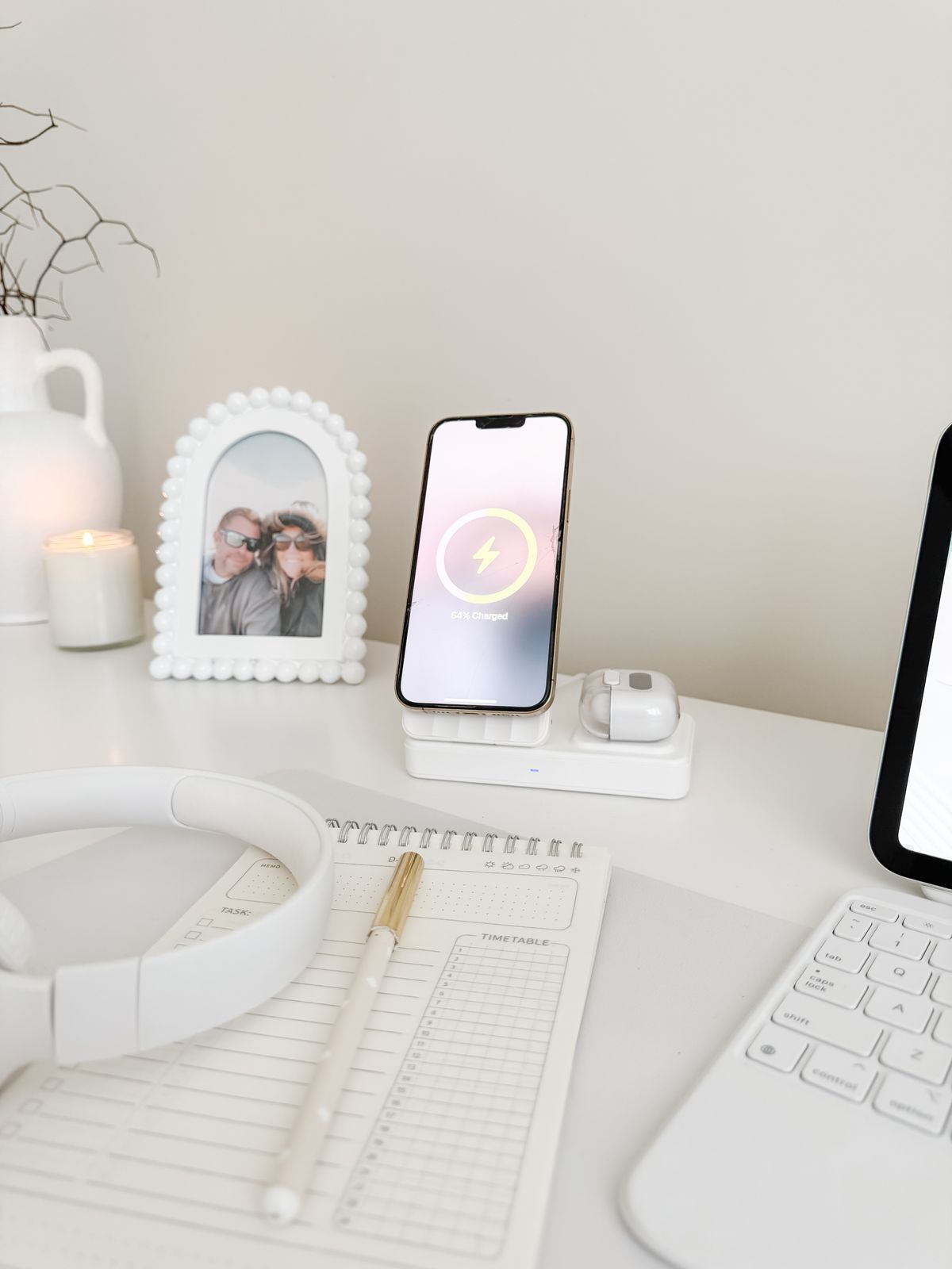How many devices can I charge at the same time?The PowerBase 4 can charge up to 4 devices simultaneously. You can charge a mobile device on the MagSafe-compatible front, wireless earbuds on the top surface, another device using the retractable USB-C cable, and a fourth device via the rear USB port — where the watch adapter can also be connected.